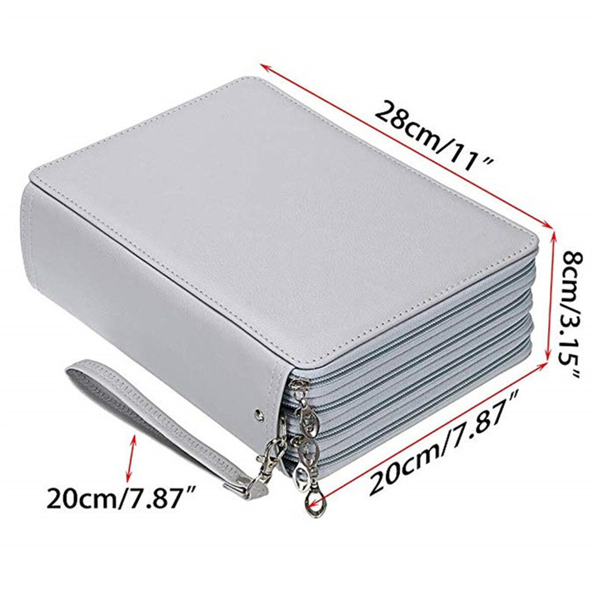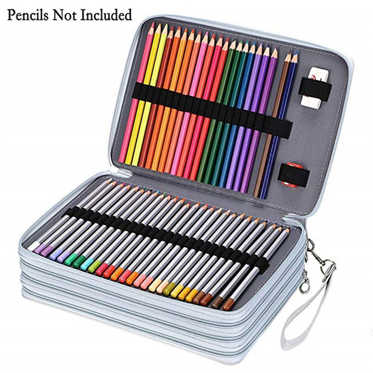 It has 200 slots for pencils /pens / pens and 2 slots for eraser or , each colored pencil or pen has its own individual hole/strap.The elastic strap holds each pencil or pen securely and prevent them from falling out or stepped on.