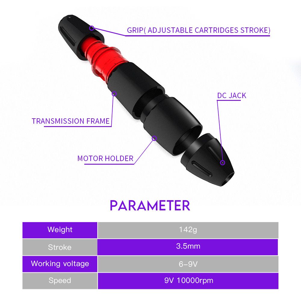 Package included:1 pc tattoo rotary pen machine(with DC cord).1 set Professional Power Supply System.1 pcs High Quality Tattoo Pedal.20 pcs Sterilization cartridge needles1 pc bandage skin1 pairs gloves