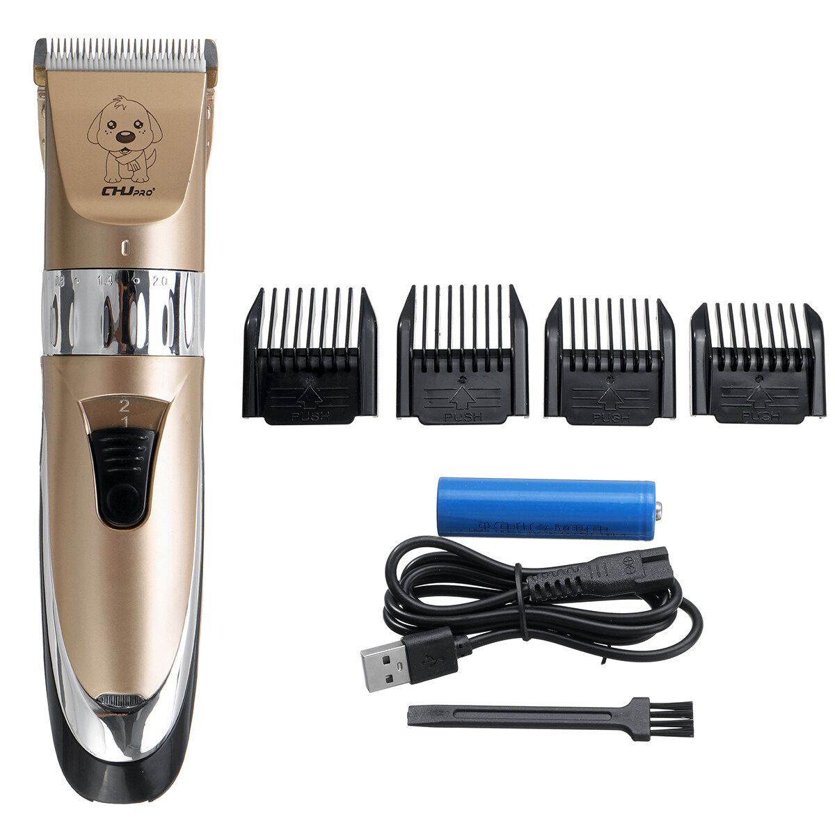 Packing included:1 x Electric Pet Hair Clipper,1 x (built-in),1 x USB Cable,1 x Cleaning Brush,4 x Comb Attachments(3/6/9/12mm),1 x Cat Collars (A3/A4/A5/A6)