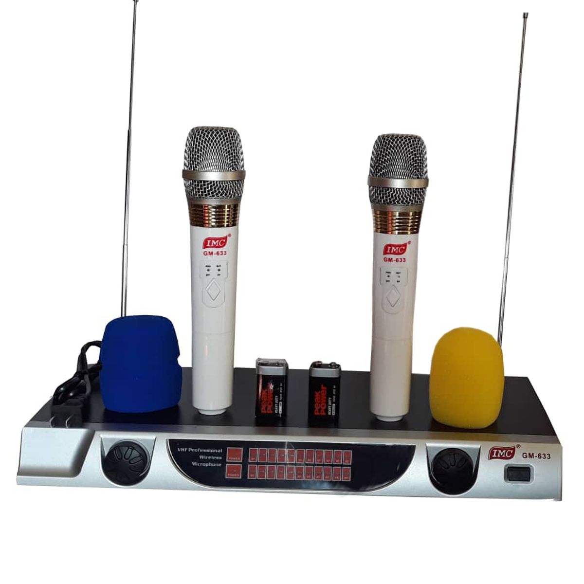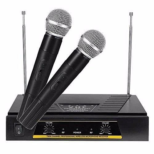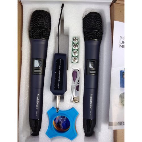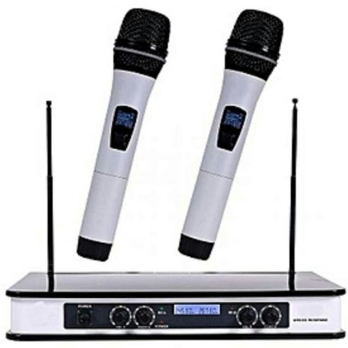 Rechargable battery=2 handheld digtal display microphone=2 usb charging jack=Charger for chagering battries=Transmitter=Cord