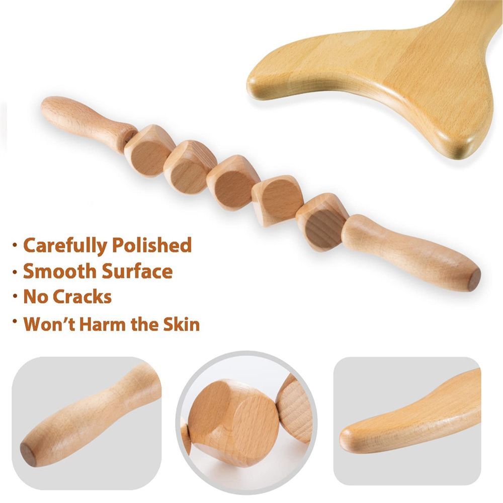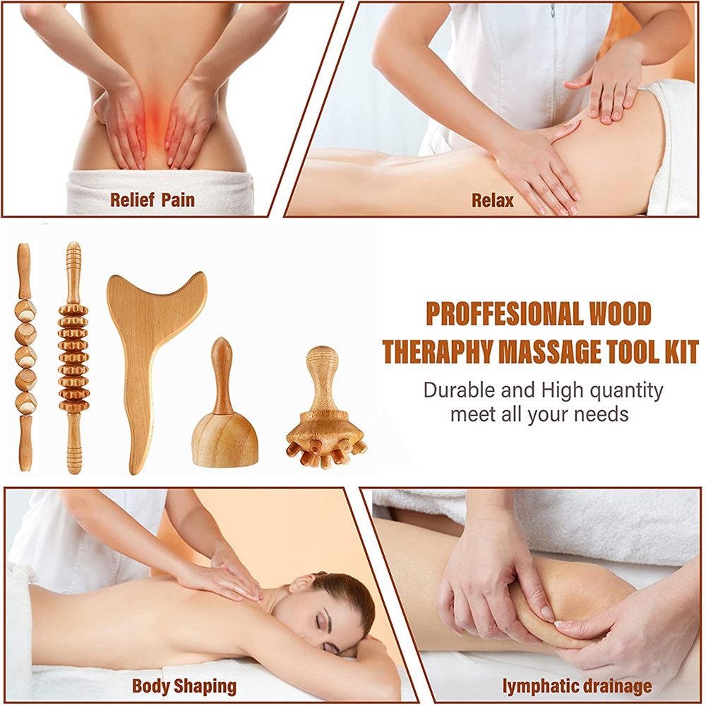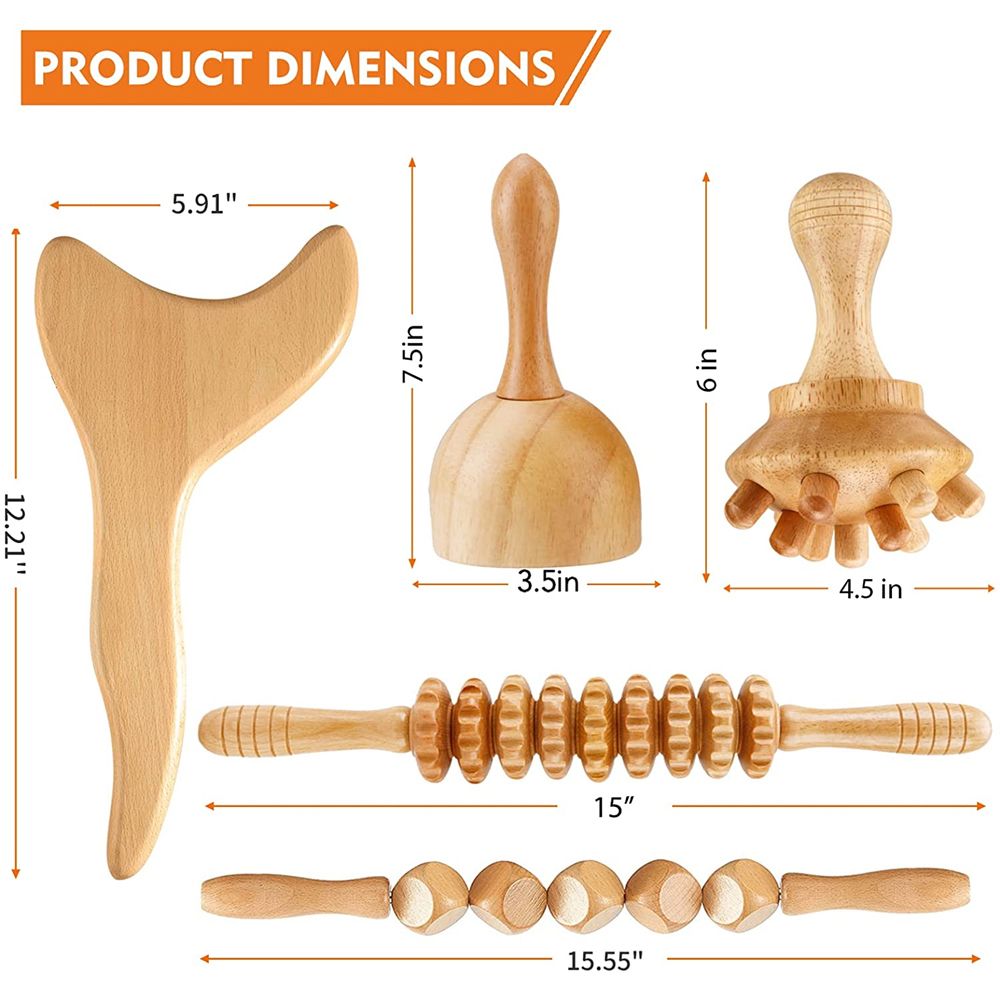 Package Include: 5Pcs/Set Wood Massager Tools1 Piece * Wooden 9-wheel Massager1 Piece * Wooden Gua Sha Massager1 Piece * Wooden Massage cube stick1 Piece * Wooden Massage Cup1 Piece * Wooden Mushroom MassagerWhy Choose Our Wood Therapy Massage Tools?1. Premium Material: Our massage tools are made of high-quality natural strong beech wood.2. Smooth Surface without Burrs: All the tools are well polished and would not be left with scratches.3. Professional Massager: 5 in 1 therapy tools can be easily used to shape your body, and meet all your massage needs.4. Function: Using our wood massager to stimulate your lymphatic drainage can relieve muscle soreness, and help to eliminate cellulite.About the Product:1. Package Included: We have gathered the most effective lymphatic and cellulite massage tools in one set; 1 x Massage 9-wheel stick, 1 x Massage 5-cube stick, 1 x gua sha board, 1 x Mushroom Massager, 1 x Wooden massage cup. It is an effective way to remove cellulite, drain your lymphatic system and give you a deep tissue muscle massage.2. Fuctions: The Maderoterapia Kit helps Improve Skin Texture, stimulates lymphatic drainage, which aids in breaking down cellulite. also, it supports proper blood flow. So, your skin receives oxygen and other nutrients needed to keep it firm and tight.3. High Quality Material: Our lymphatic drainage massager is made of solid beech wood, No crack, no burrs, smooth sanding and won't scratch the skin. The body sculpting tools help you eliminate fat and then keep the skin firm and smooth.4. How to Work: Use wooden massage tool together with body oil. Massage for 10 minutes a day to relax body and mind, stimulates the lymphatic drainage and consequently helps eliminate cellulite, while at the same time destroys fat cells, thereby improving the flow of blood and lymph throughout the body and then keep the skin firm and tight5. Crowd: help improve blood circulation, lymphatic drainage and Anti Cellulite. Suitable for athletes, coaches, sports athletes, dancers to perform a perfect warm-up. Essential equipment for any professional masseuse, therapist, coach and coach. Very suitable as a gift for family and friends who love sports.How to use it?1. Relax your body, start with massage oil, and make sure your skin is lubricated, this is a very ant step to keep you comfortable.2. Use the 9-wheel stick to gently roll, and gradually increase the intensity until you feel comfortable after you get used to it.3. You can use the 5-cube stick to deepen the stimulation of the fat, help destroy fat cells and eliminate cellulite.4. Use the mushroom massager to knead in circular motions, and focus on the fat.5. Use the Gua Sha board to massage in the direction of lymph flow, which helps lymphatic drainage.6. Use the wooden massage cup to push the fat or the muscles.7. Keep warm after the massage, drink warm water to help the body expel harmful substances.8. We selected the 5 most effective massage tools for professional massage, which can meet your different needs. Notes:1. Since our products are all made of natural wood, some products may have a few defects, such as cracks, spots, etc. with the change of environment.2. If the product has a serious problem, we are willing to replace it for free or . In such case, please contact us and do not open a dispute. 3. If the defect is not so serious, we would be very apprecaited if you can understand and accept it.4. Our products are made of 100% natural wood. Every texture and color has a subtle difference, as well as a slight difference from the picture. Look forward to your understanding.