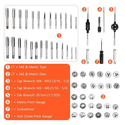 - SAE & METRIC SIZE: 4-40, 6-32, 8-32, 10-24, 10-32, 12-24, 1/4-20, 1/4-28, 5/16-18, 5/16-24, 3/8-16, 3/8-24, 7/16-14, 7/16-20, 1/2-13, 1/2-20, 1/8-27, M30.5, M40.7, M50.8, M61.0, M71.0, M81.25, M91.25, M101.0, M101.5 and M121.75, 27 taps for Internal Threads and 27 Dies for External Threads.