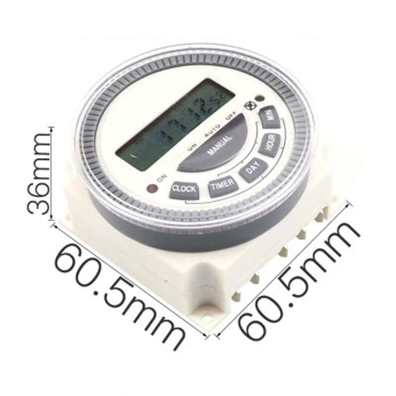 Rated Control Voltage: AC 200V-240V 50/60Hz AC Switching Capacity: AC 250V 8A ON/OFF Operation:17 ON/OFF Temperature: -20~+55 degree Product Name: Programmable Timer Model No.: CN304A Overall Size(.): 60.5*60.5*36mm/2.4*2.4*1.4 inch Mounting Hole Diameter: 3.5mm/0.1 inch Mounting Hole Center Distance: 54 * 54mm/2.1 inch * 2.1 inch(L*W) Color: Gray + white Material: ABS Package Contents: 1 * Programmable Timer