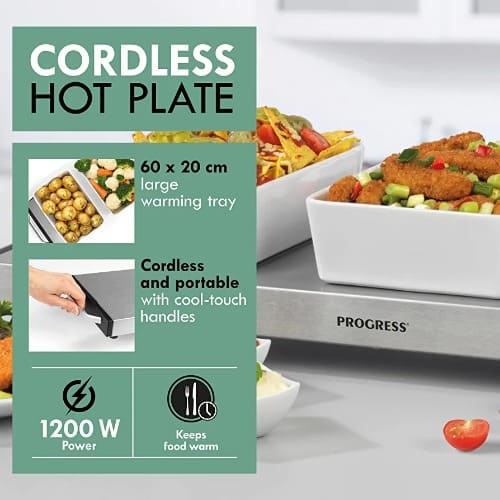 Be the perfect host with this essential Progress Cordless Hot Plate, designed to keep food warm at the table for up to 60 minutes.