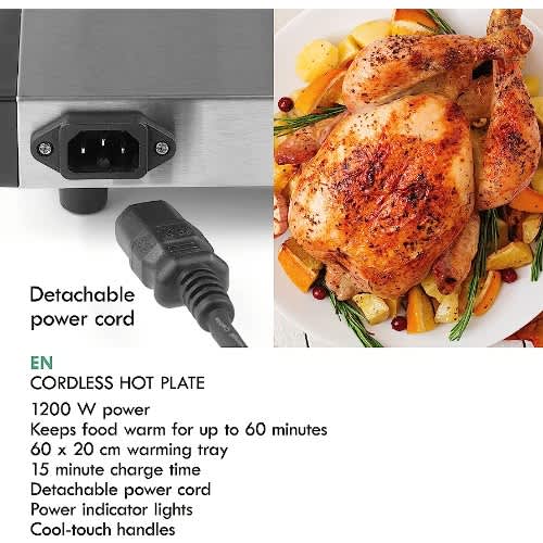 Be the perfect host and ensure food is kept piping hot with the Progress Cordless Hot Plate. Generously sized, the 1200 W warming tray measures 60 x 20 cm, ensuring that catering for parties and events is effortless. Ideal for using as a plate warmer or buffet server – simply charge for 15 minutes, then enjoy up to 60 minutes of usage time. The detachable power cord makes this food warmer conveniently portable, ideal for use at the table or during family gatherings and festive parties.