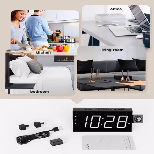 LED time(12/24 hour system adjustable), date and centigrade temperature and fahrenheit temperature display.Three brightness modes adjustment, the brightness can be adjusted automatically or manually.Alarm function and snooze function, the alarm sound is beep which lasts for about 1min, during the alarming time the beeping sound weakens gradually. Snooze time is 5mins by default.USB , external -off protection function, convenient and practical.You can place it on your table, desk or hang it on wall at your home and office.Black and white outer shell, white, red, green, blue, pink, orange diaplay colors for you to choose from.