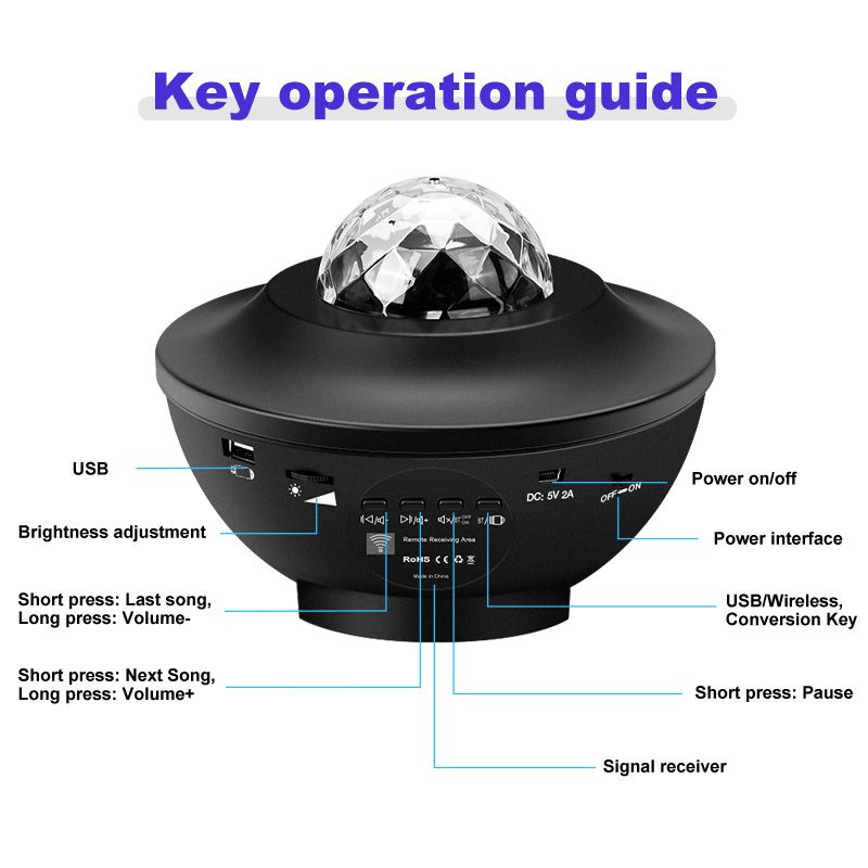 Functions: LED Projector light, Music Speaker, Bluetooth, Remote control