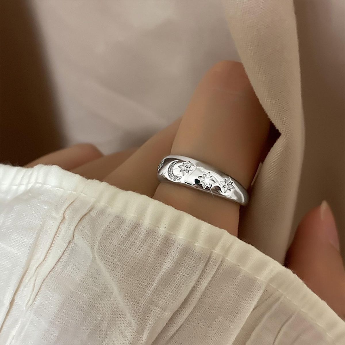 Being an upscale proposal and wedding ring and stylish celebrity jewelry accessory, this proposal ring is features sparkling faux zircons and star moon carving design.