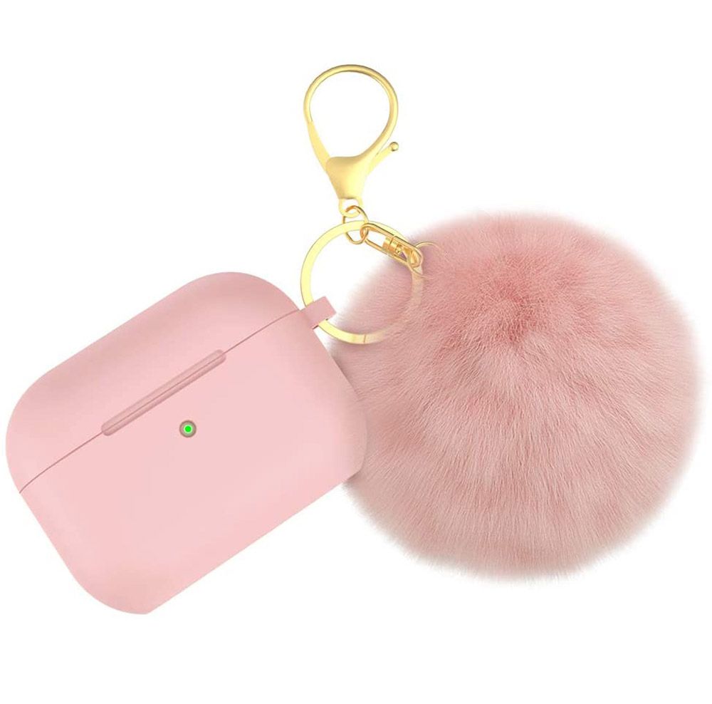 Silicone Protective Cover with Cute Pompon Keychain for AirPods Pro-Pink