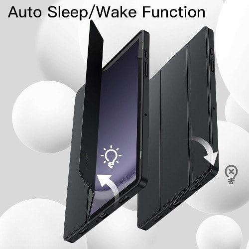 [Auto Wake/Sleep] This protective case with built-in magnets supports automatic sleep/wake function. Wake on open and sleep on close. More energy-saving