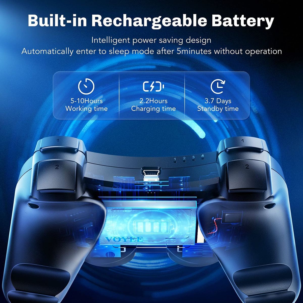 - 5-10 Hours Playtime: the PS3 gamepad built-in 450 mAh re-chargeable battery, it takes 2-3 hours to fully charge for 5-10 hours of playing. 10 mins auto sleep mode for saving power, prolong the lifespan of battery.