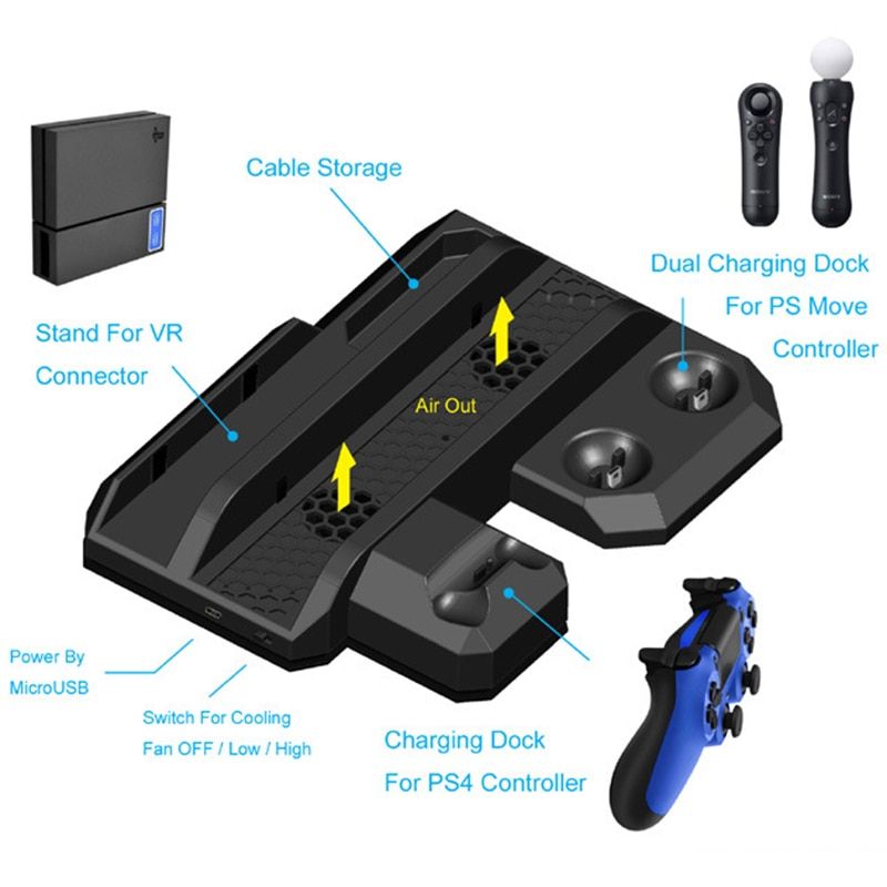 The multi-charger station can charge one PS4 DualShock4 controller and two PS Move Controller(PS Move with Mini USB port)