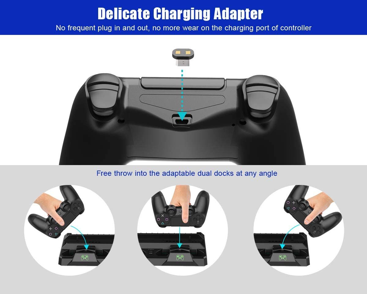 - Dual Charging Station: The docking station charge two wireless controllers. Specially designed mini dong-le inserted in the front USB port of DualShock 4 controller - No frequent plug in and out, no wear on the USB port. Powered by PS4 USB, no extra power needed. Twin LED windows show the charging status