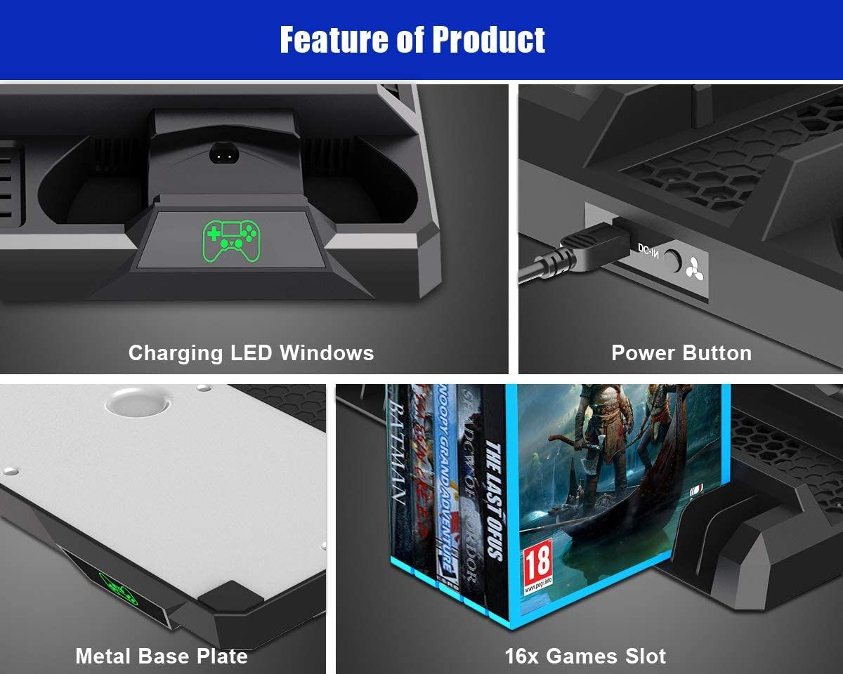 - All in One PS4 Stand: The vertical stand was designed for PlayStation 4 series of games console - PS4, PS4 Slim and PS4 Pro. Keep your PS4 in a vertical position. Compact space saver and desk organizer for your bundle of games accessories with 16 slots for better storage the Blue-ray games
