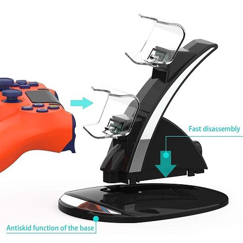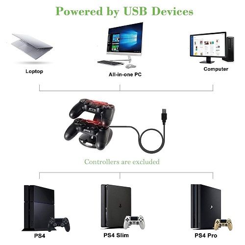 Product description Charger Stand for Sony Playstation 4 Gaming Control with LED Indicator Enjoy Playing Games: 1.Dual Wireless Controller Charger for PS4 Controller 2.Connecting the cable will also allow charging while still being used 3.This USB Charger Station provides an easy and quick way to charge and store your PS4 controllers securely 4.Power through the USB port from either the PS4 console, PC or wall power source (Wall Adapter is not included) Product Details: Cable Length: About 1.64ft / 50cm / 19.68inch Input Voltage: DC 5V 1000MA Output Voltage: DC 500MA for each controller charge slot LED Indicator: Lights off - Full Charged ; Blue - Charging Built-in Protector Chip: Never over charged your PS4 controllers even charge it for overnight Fully Charge Time: Full charge can be completed within 2.5 hours when charging one controller, Full charge to two controllers simultaneously within 3 hours
