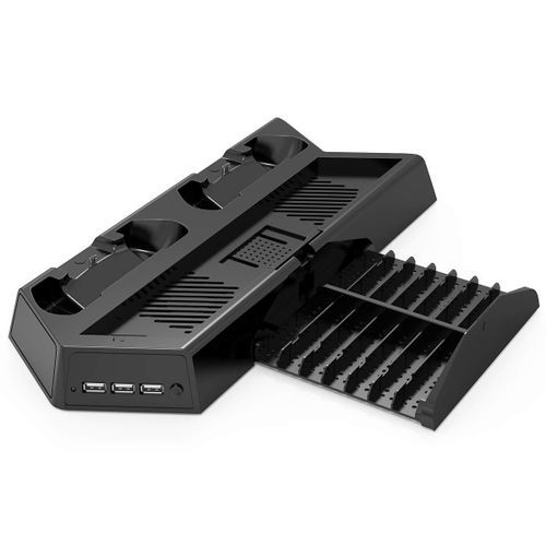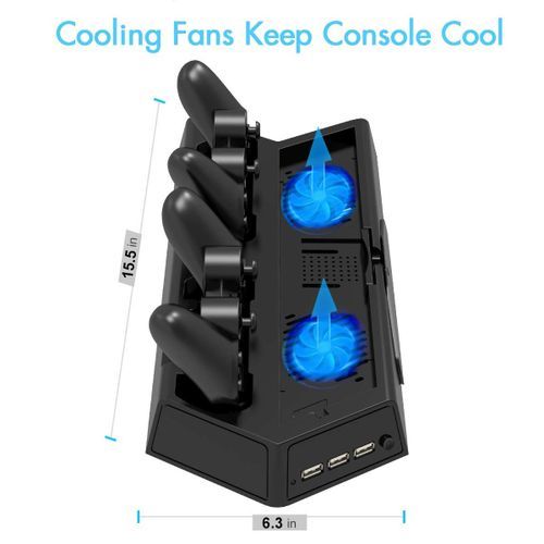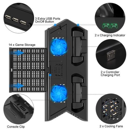 - All-In-One: Vertical Stand + 2 Cooling Fans + 2 Controller Charging Station+ Games Storage+ 3 Extra HUB USB Ports