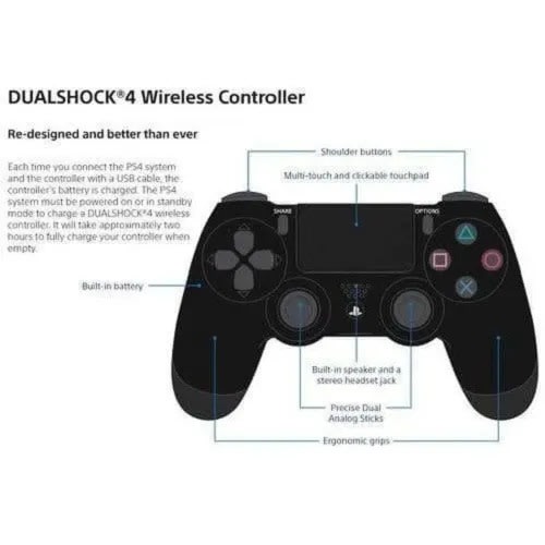 The DUALSHOCK4 wireless controller features familiar controls while incorporating new ways to interact with games and other players. Improved dual analog sticks and trigger buttons offer an even greater sense of control, while the capacitive touch pad opens up endless potential for new gameplay possibilities. Experience the evolution of play with the DUALSHOCK4 wireless controller.A revolutionary controller for a new era of gaming, the DualShock 4 Wireless Controller features familiar PlayStation controls and innovative new additions, such as a touch pad, light bar, and more.Located on the top of the controller, the TouchPad offers gamers completely new ways to play and interact with games.Three LEDs offer a simpler way to easily identify players and quickly see useful game information, like when a character is low on health or has taken major damage.Share ButtonShare triumphs and accomplishments by streaming live gameplay to Ustream or uploading recorded videos to Facebook.Built-in Speaker and Stereo Headset JackEnjoy high-fidelity sound effects of games from both the TV and also from the controller. Chat with friends playing online with the bundled headset.New ShapeImproved ergonomics means it's more comfortable to hold, while improved analog sticks and buttons mean more precise control.Enhanced VibrationMultiple vibration motors give games a greater degree of expression and heighten the sense of immersion for players.