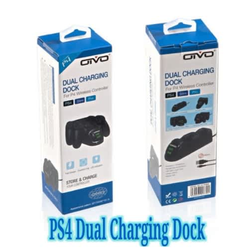 Allows you to securely store and charge up two PS4 controllers simultaneouslyPower through the USB port from either the PS4 or PCTwo controllers can be charged simultaneouslyConnecting the cable will also allow charging while still being used and 5V output with 200 to 400 mAHFull charge can be completed within 2 hours when charging one single controller and Full charge to two controllers simultaneously within 4 hours.This product is compatible with Playstation PS4 Wireless Controller, it is possible for you to charge your controllers from anywhere within your house. It does not work on third party battery. Features blue and red LED indicators for charge status. Has matte and glossy black details.Specification:Type: Charger StandColor: BlackMaterial: PlasticCompatible with: Sony Playstation 4 PS4 Gaming Controller OnlyCharger Dock Only, the console and controller are NOT includedPackage Content:1x Dual Charger Controller Stand for Playstation PS41x USB Cable