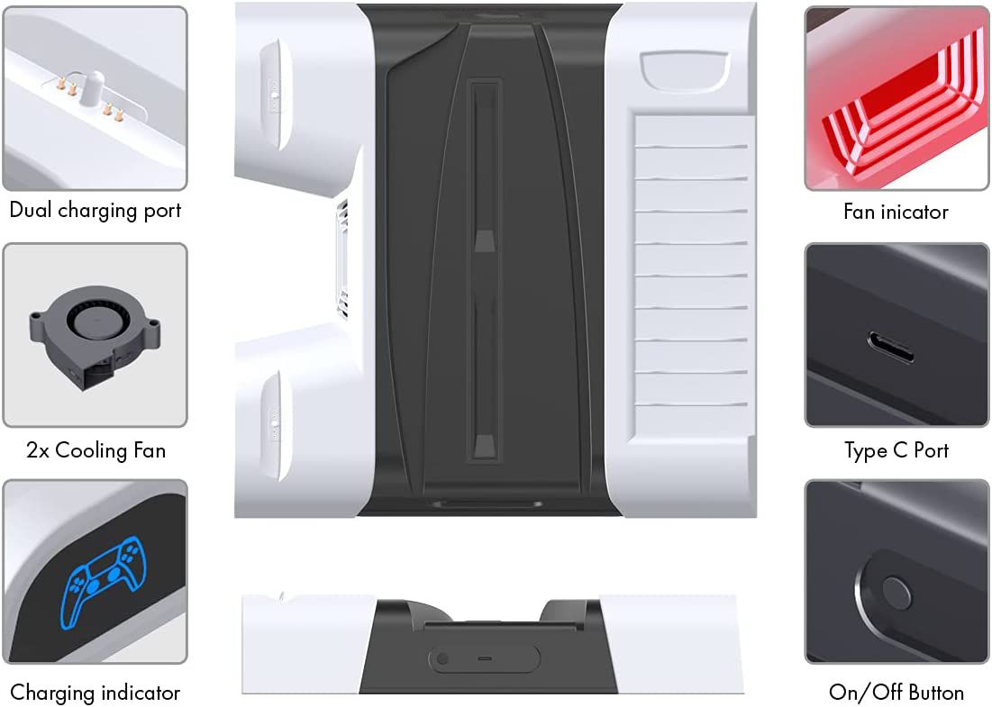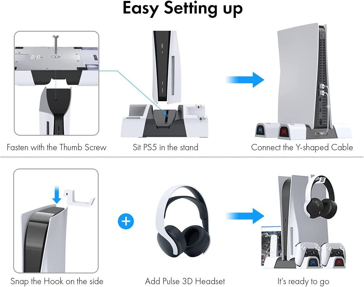 - [All in One PS5 Stand] - The multifunctional stand is designed for PlayStation 5 Ultra HD and Digital editions. Features dual charger docks and cooling fan and with corresponding LED indicators. Keep your PS5 in a vertical position and better store and organize wireless gaming headset, Blu-Ray games and media remote for any gaming nerds