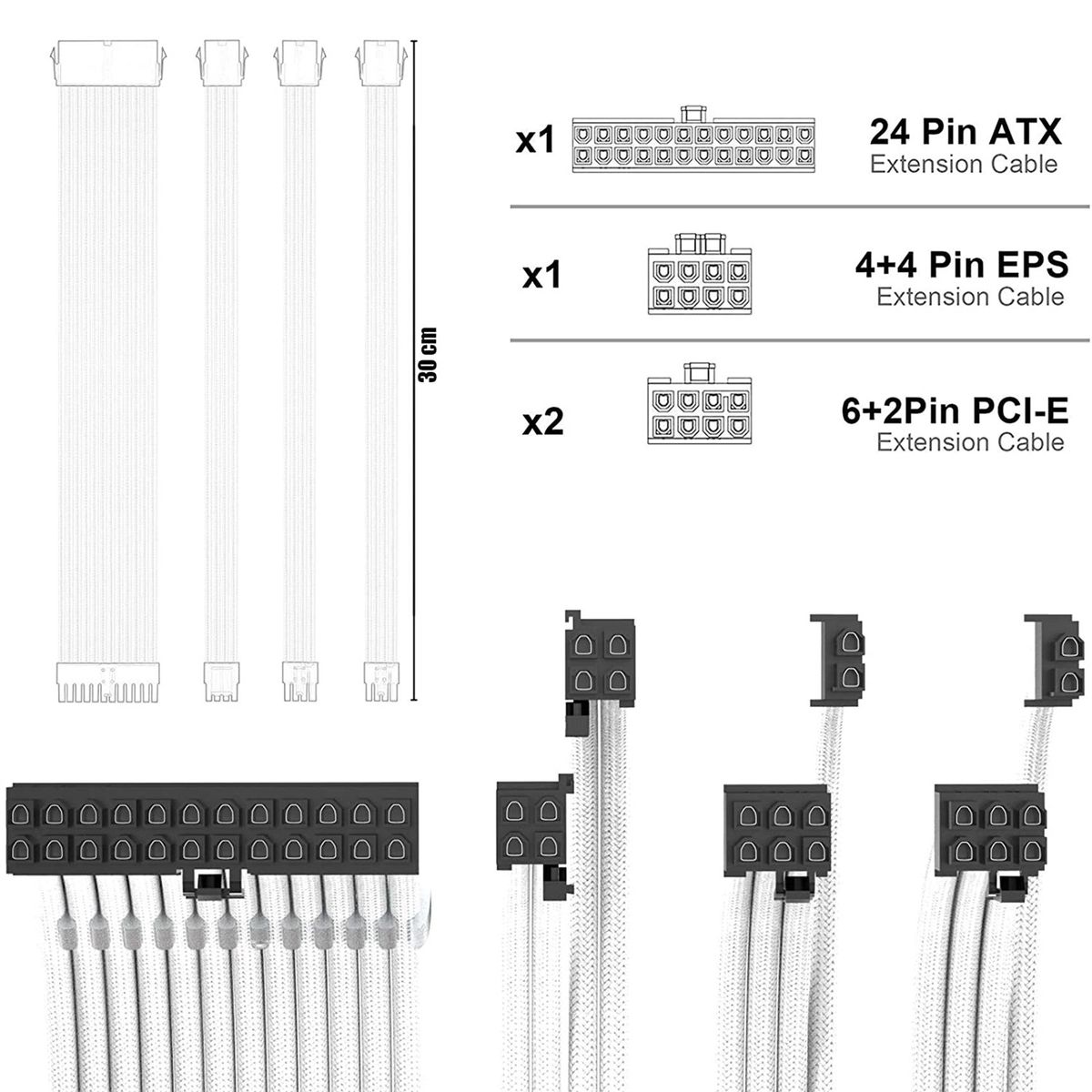 3.0 New Generation PSU Cable - The pc cable kit uses 150 x 0.08mm pure copper tinned wires and is wrapped with super soft silicone, which can be easily formed into the desired shape. Through market research, we found that other brands of PSU extension cable kits are difficult to bend. Due to processing problems, products of other brands are prone to produce odor when used at high temperature. The cable kits have effectively improved this situation