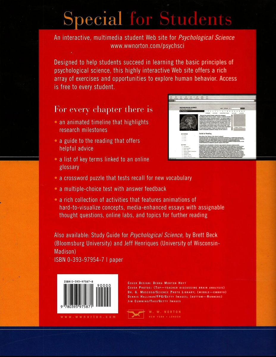 Major principles and contemporary themes drive this narrative overview of the field touching on the latest ideas and findings in biological, cognitive, social, developmental, personality, and clinical psychology. Gazzaniga and Heatherton provide the latest insights on a wide array of topics and issues including the growth of children's minds, the ways we learn, the impact of serious head injuries on behavior, the reasons why we discriminate against one another, the possibility of changing our personalities, and the causes and treatments of psychological disorders.