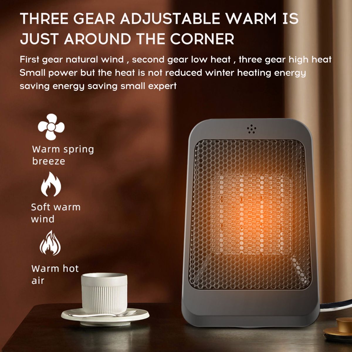 3-gear adjustable, the first gear is natural wind, the second gear is low heat, the third gear is high heat, the power is small but the heat is not reduced, energy-saving heating in winter.