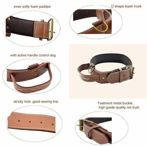 PU material,collar with handle strap, Inner with Softy Padding, not burt neck of dog when used to the Power after, Handle easy control Dog , D-Ring Easy Hang to dog leash rope,prevent dog strong power.