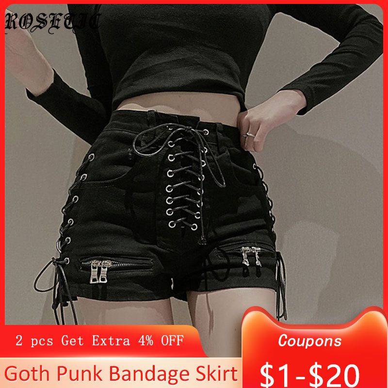 Rosetic Vendaje Shorts de mezclilla Mujeres Streetwear Gothic Jeans Mini cintura alta con cordones Casual Zip Black Goth Club Fashion 2021 Mini Shorts Hot Punk Estilo coreano