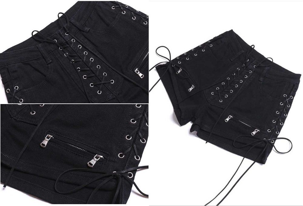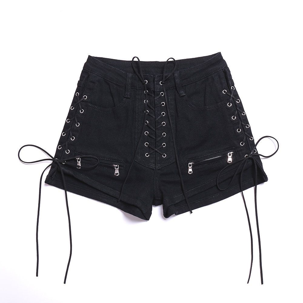 1X Rosetic Bandage Denim Shorts Women Streetwear Gothic Jeans Mini High Waist Lace Up Casual Zip Black Goth Club Fashion 2021