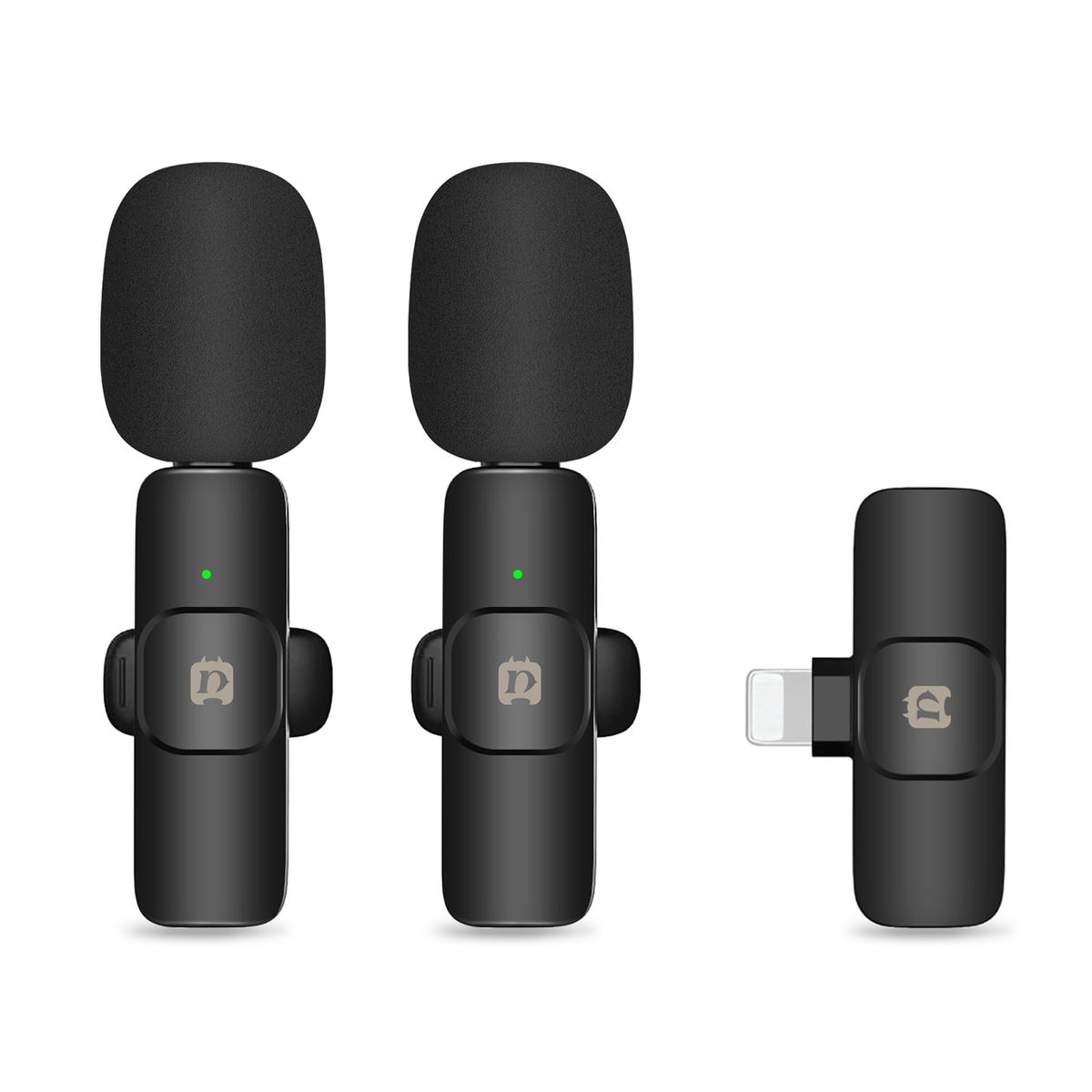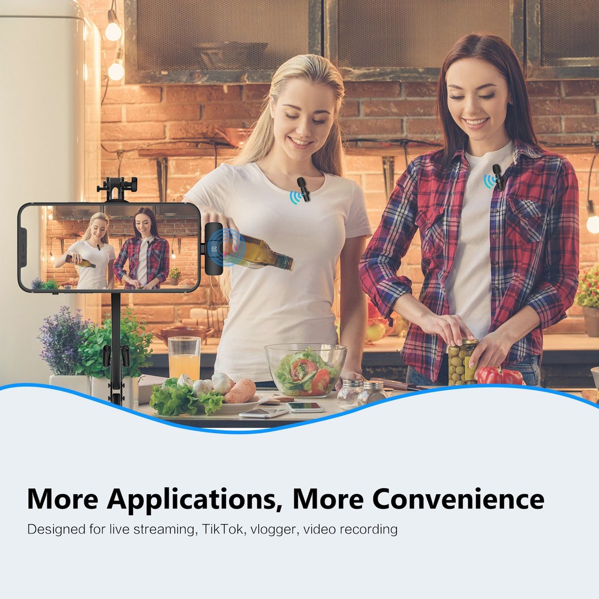 【Mini Wireless Microphone System】With one 8-pin receiver and two clip-on mini microphones, this wireless microphone system is compatible with iOS smartphones and tablets, providing high quality sound for live streaming, vlogging, video recording, interview and so on.