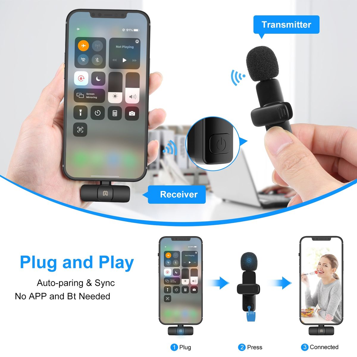 Features:【Mini Wireless Microphone System】With one 8-pin receiver and two clip-on mini microphones, this wireless microphone system is compatible with iOS smartphones and tablets, providing high quality sound for live streaming, vlogging, video recording, interview and so on.