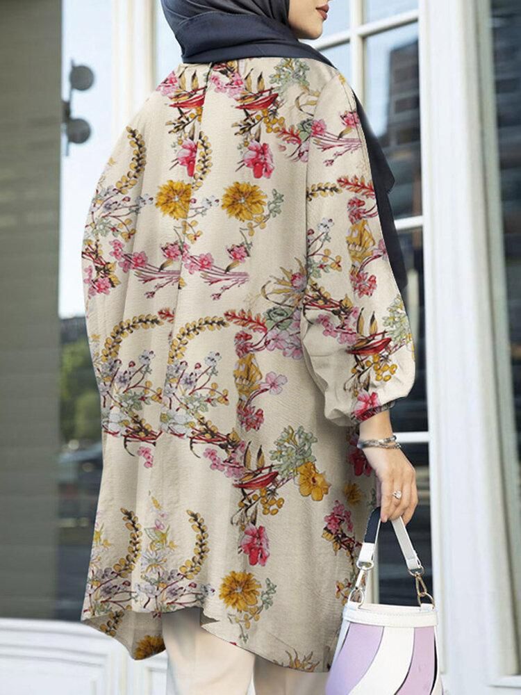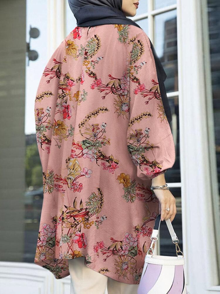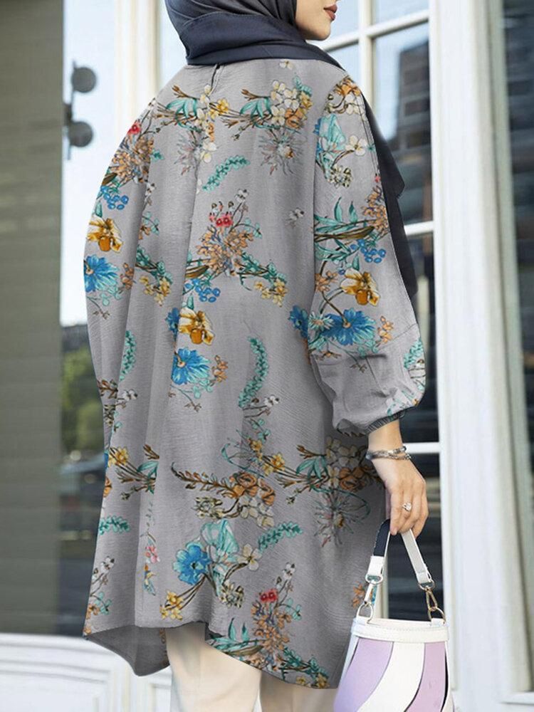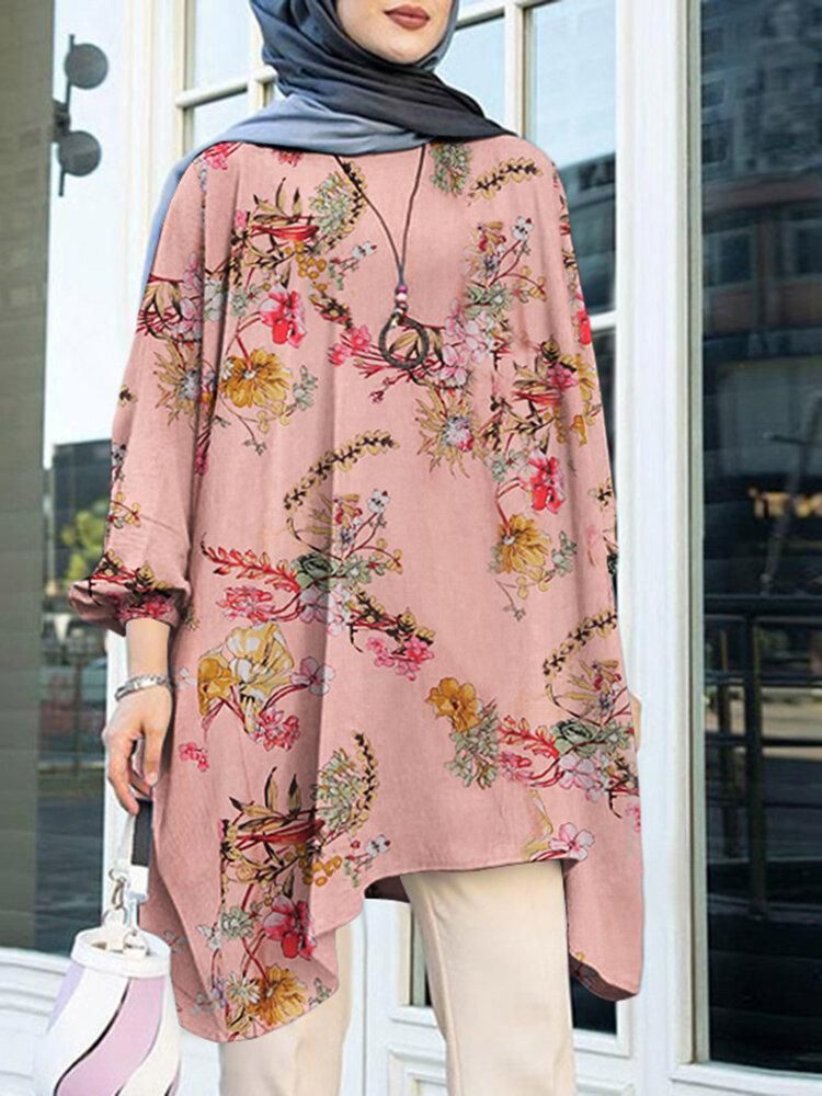 Buy Puff Sleeve Floral Printed Irregular Hem O-Neck Loose Blouse in Nigeria