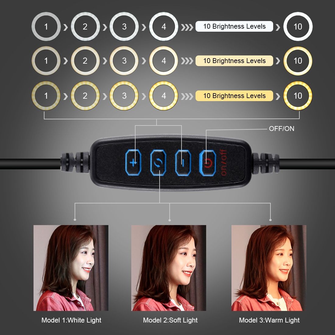 4. 3 colors lighting mode adjustable brightness for your choose,you can adjust the color and brightness very easily, perfect brightness can be achieved without installing extra colorful filters. Three colors of soft natural light illuminate your beauty in different occasions.