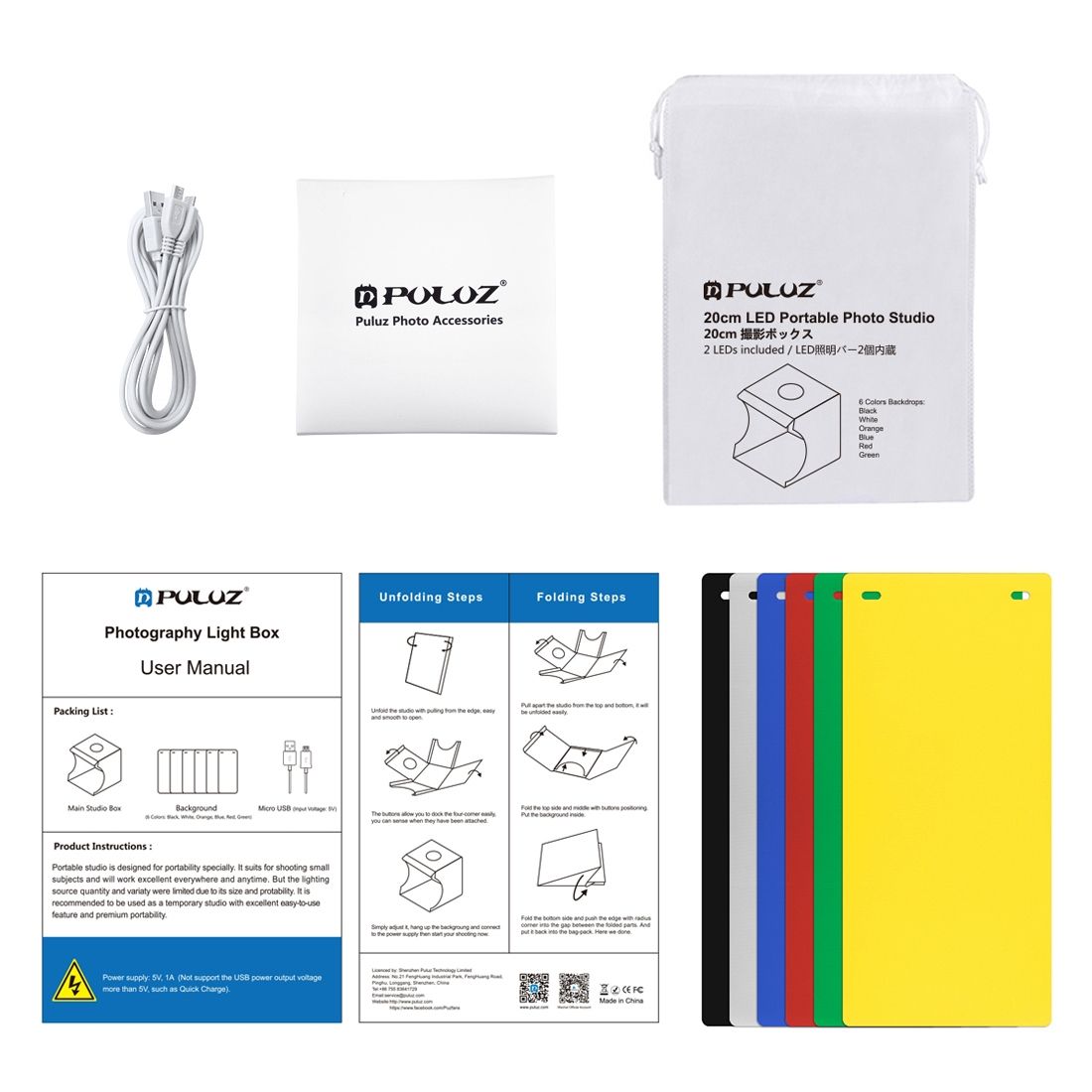 PULUZ 20cm Include 2 LED Panels Folding Portable 1100LM Light Photo Lighting Studio Shooting Tent Box Kit with 6 Colors Backdrops (Black, White, Orange, Red, Green, Blue), Unfold Size: 24cm x 23cm x 22cm