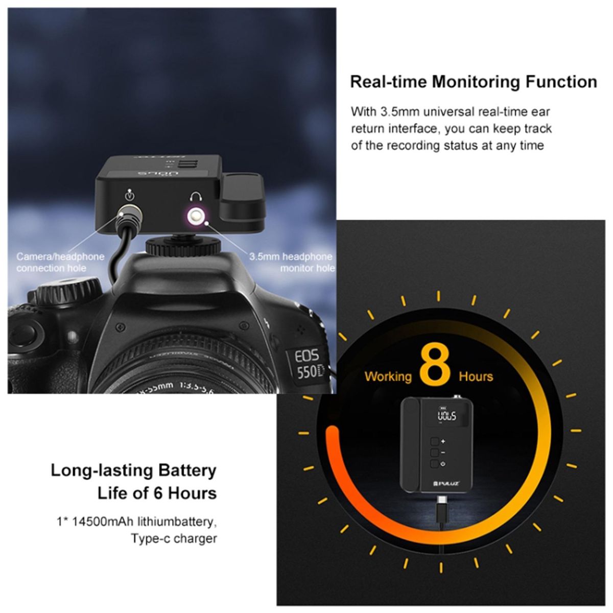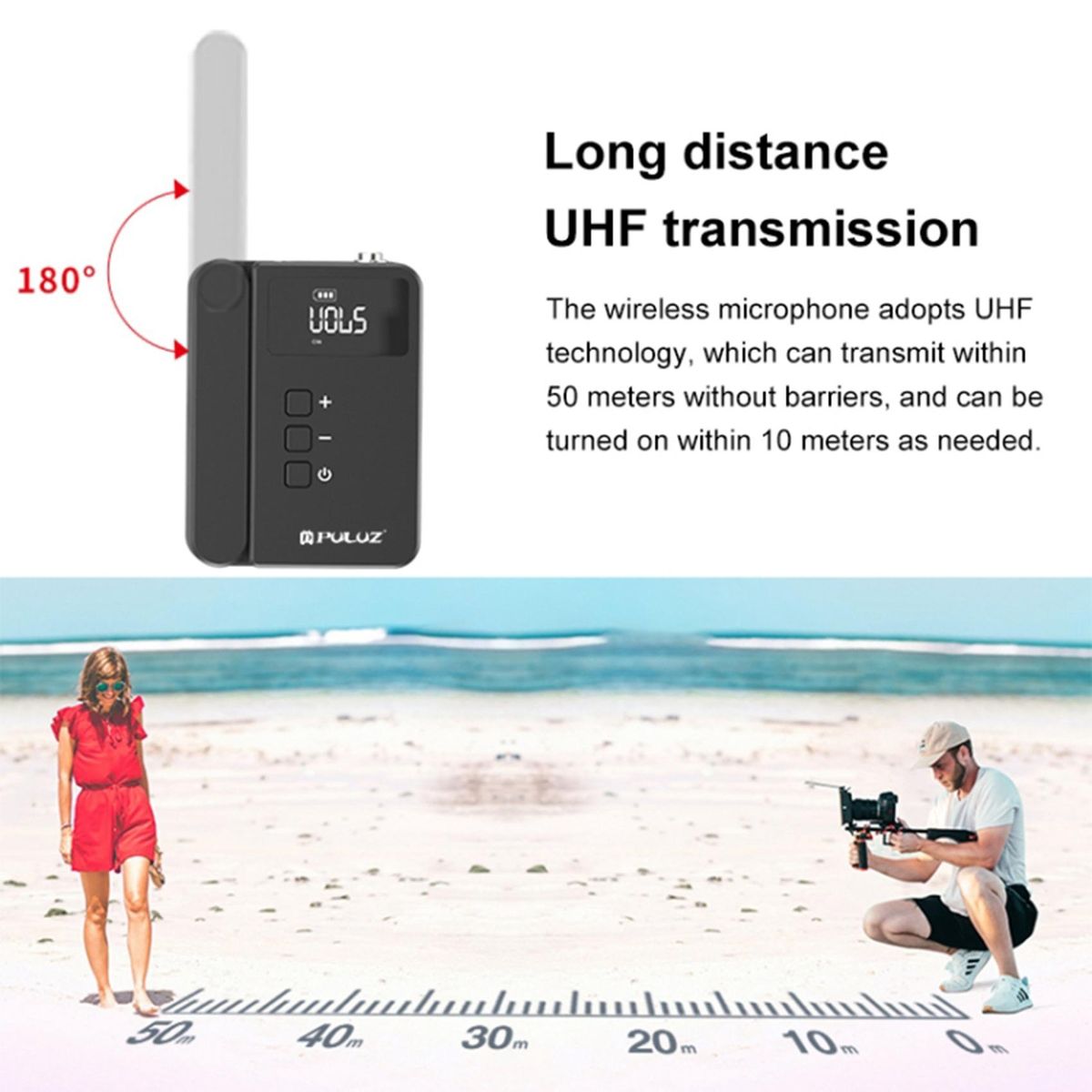 1. UHF Wireless Transmission Tech: Wireless technology with more stability and stronger anti-interference, can deliver long transmission distance. 16 switchable channels available, you could quick to choose the stronger signal channel, recording higher fidelity sound.