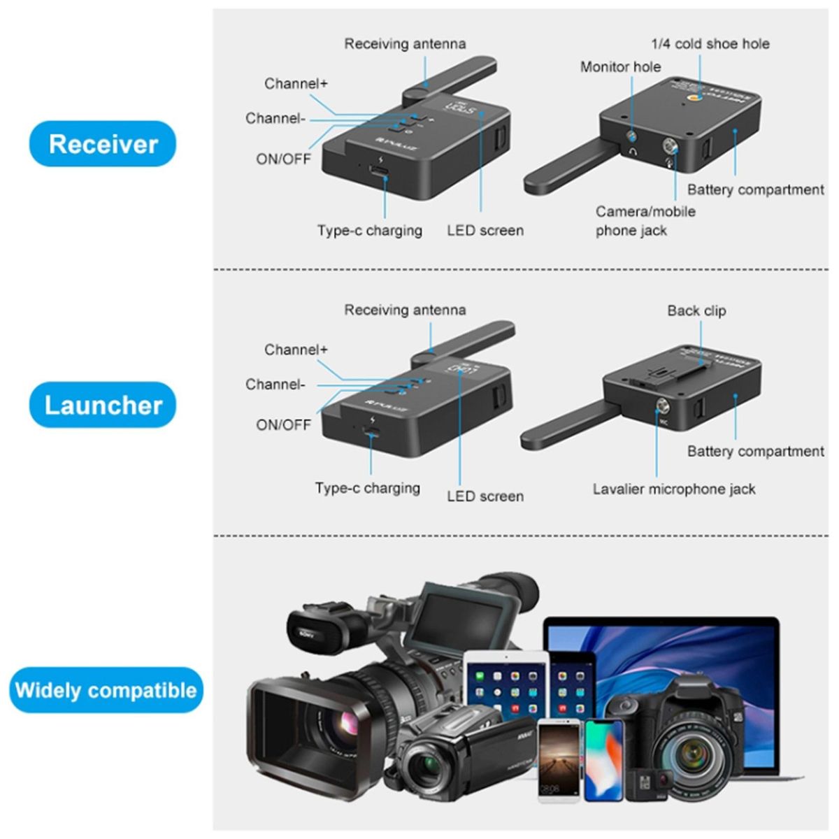 4. Multi-Device Compatibility: Included with a universal 3.5mm port and cold shoe adapter, you can mount the receiver to smartphone, digital SLR cameras, camcorders, recorders and PC, meeting shooting and recording needs on various occasions e.g. interview, vlogging recording, YouTube live streaming, presentation and more.
