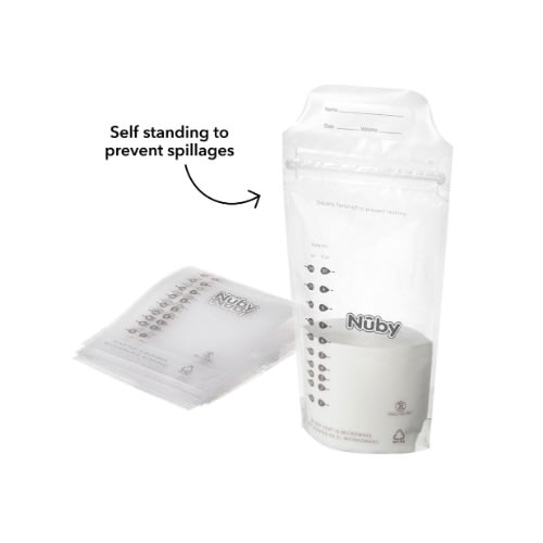 Simply tear the perforated seal and either pour your breastmilk into the bag or pump directly using a Lansinoh breast pump. Gently squeeze out any air before sealing the top of the bag and write the date and amount expressed on the top tab. This can then be stored in the fridge for up to 6 days or in the freezer for up to 6 months, either laid flat or upright.