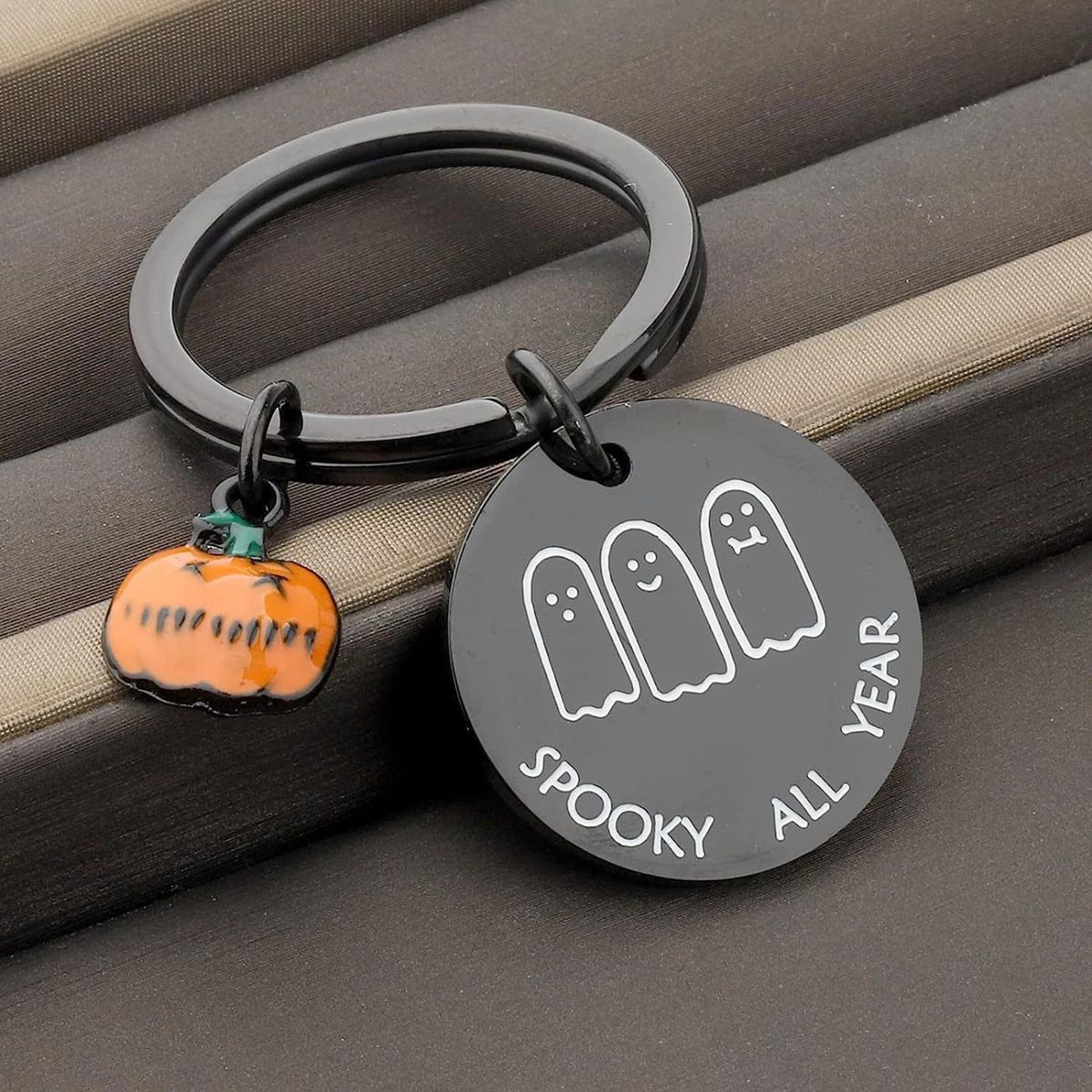Our adorable pumpkin key chain! this charming accessory is the perfect way to add a touch of halloween spirit to your everyday life. with its delightful cartoon ghost print, it's sure to bring a smile to your face every time you use it. .