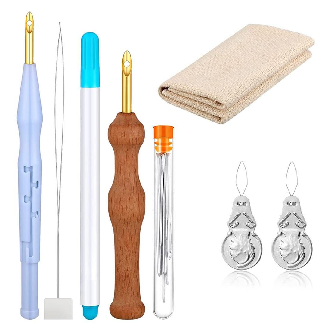 What you will receive: 1 package including 1*wood handle jab, 1*adjustable plastic jab, 1*long threader, 2*needle threader, 1*water eraser, 1*9pcs big eye needle, 1 *(25*25) poke embroidery cloth, beautiful embroidery combination set, suitable for beginners and enthusiasts
