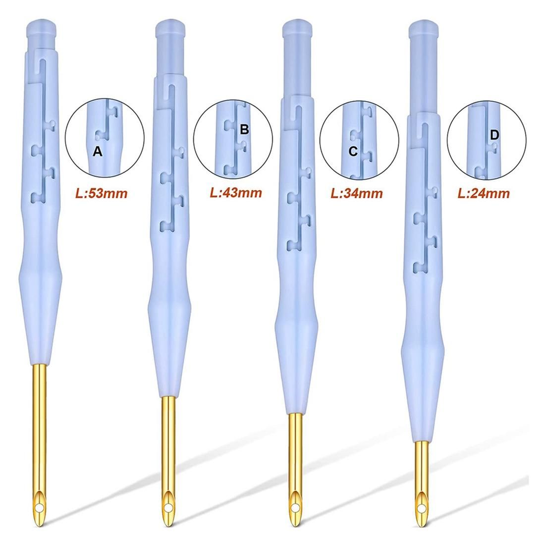 Adjustable Punch Needle: The plastic handle punch needle has 4 slots to suit your needs, you can slide the small pot on the handle into different slots to get punch needles of various sizes, including A- 53mm, B-43mm, C-34mm, D-24mm