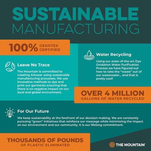 We are pioneers of water based ink and have perfected it's use to create photo-realistic imagery that is Not attainable by other screen printers ,Created, developed, dyed, and printed in Marlborough, NH ,The Mountain uses only environmentally friendly water-based inks and dyes Oeko-tex 100 Certified which guarantees our shirts are free of chemicals harmful to your body.