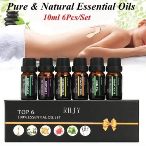 A set of 6 10ml essential oil blends: Rest & Relax, Breathe Easy, Stress-Free, Pure Healing, Happy Citrus 100% pure and natural essential oil blends Great for traveling, giving as a gift, or experiencing a little bit of everything in your oil collection! Suggested usage: Aromatherapy oils,Oil for diffusers,Humidifier oils,Oil Burners,Spa and Air Purifier. LAVENDER SPEARMINT LEMONGRASS SWEET ORANGE TEA TREE EUCALYPTUS Frankincense Rosemary.