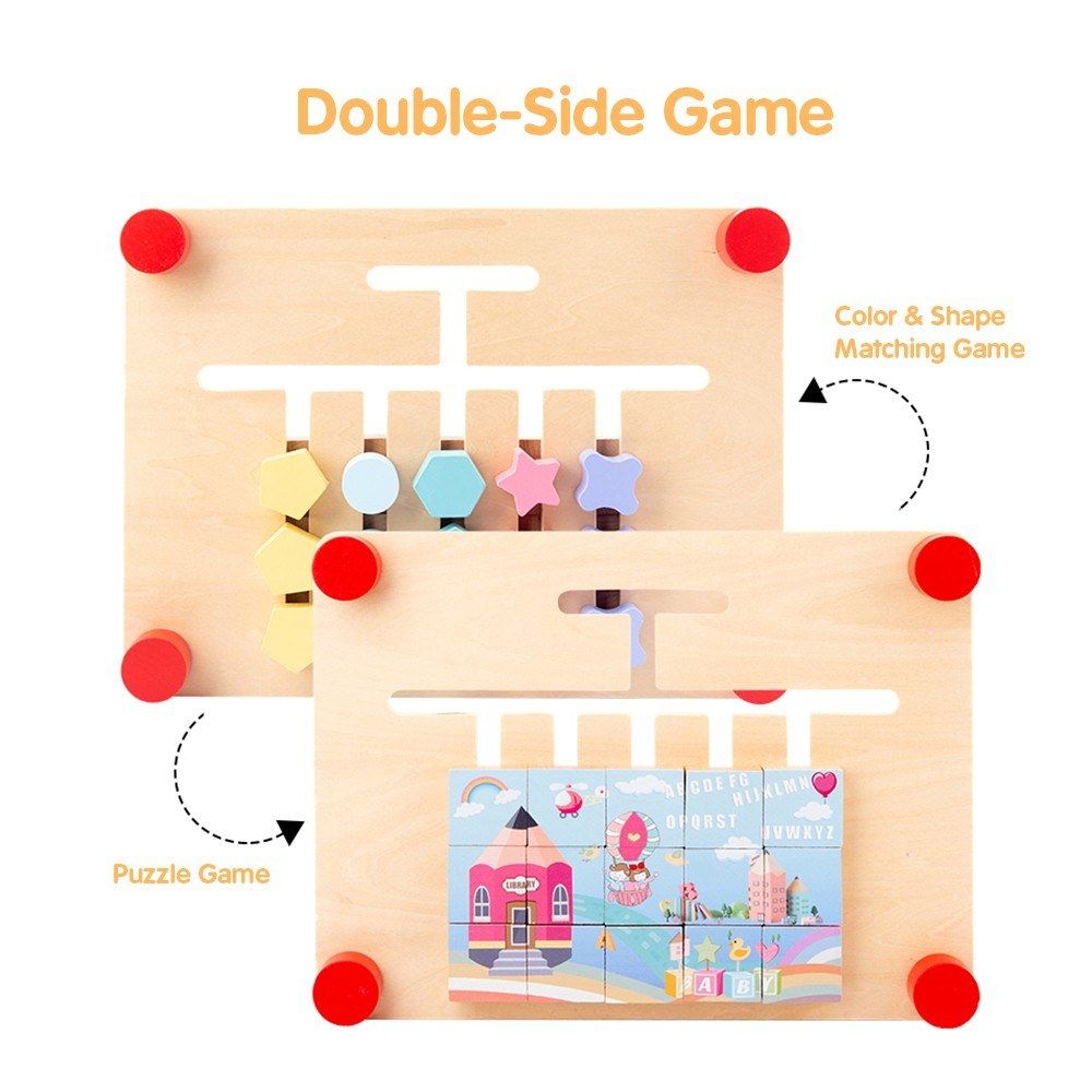 Double-Side Game: Package includes a puzzle color game board, an hourglass and 10 cards. Color and shape matching game on the front side and puzzle game on the back.
