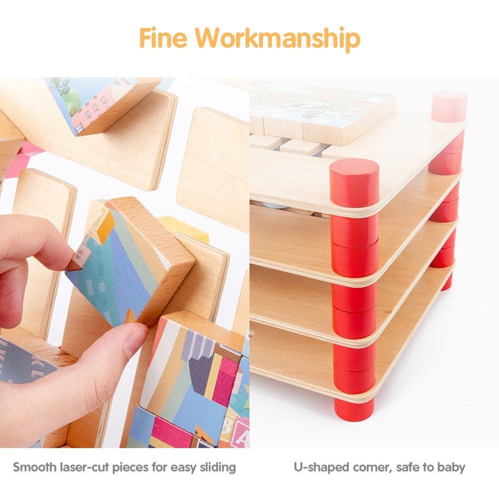 Fine Workmanship: Smooth laser-cut pieces for easy sliding, U-shaped corner of the wood board for protecting baby\\\'s delicate hands.