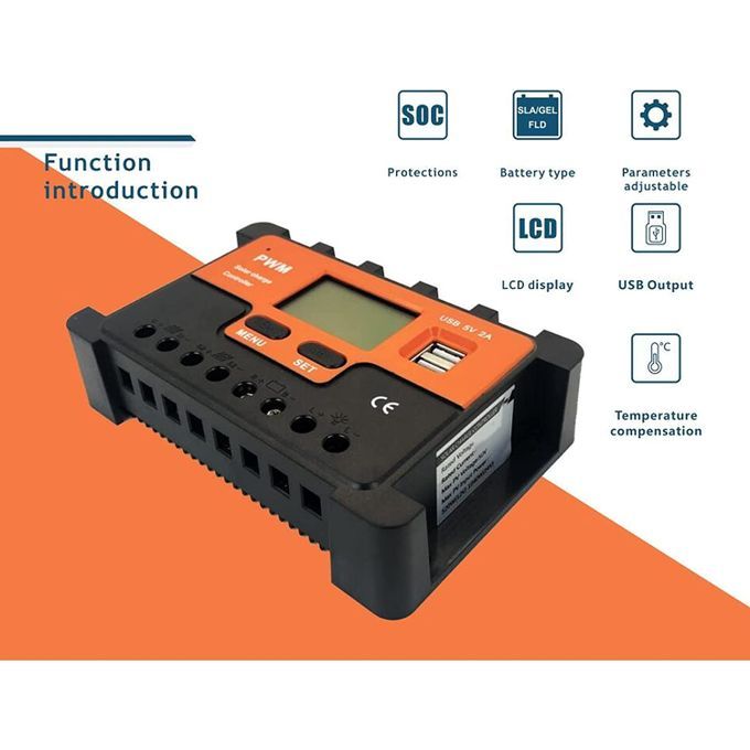 LCD Display: The solar controller is equipped with an LCD display, which can clearly display the status and data, and can easily switch modes and parameter configuration. The large screen LCD display with backlight can adjust the charging and discharging parameters, and has a power off memory function.