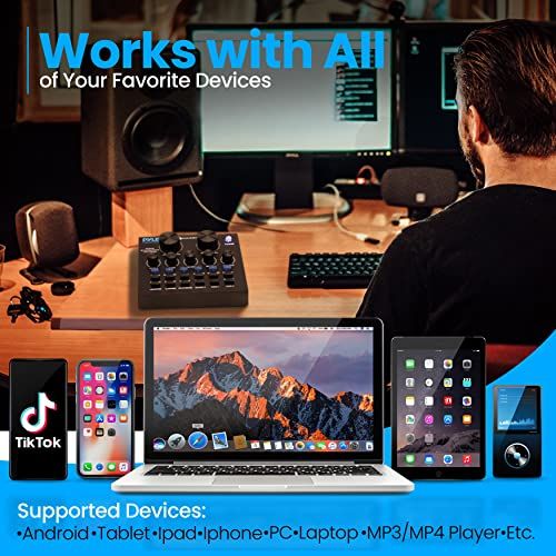 - MULTIPLE INPUTS:The ompat size, external sound ard sound hanger broadast mixer is equipped w/ live1 and live2 and aompany instrument USB port, 3.5mm earphone speaker and headset output, & 3.5mm ondenser mirophone and 6.35mm dynami mi input