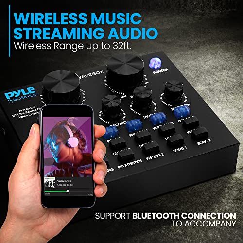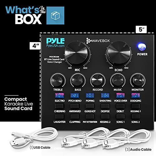 Details: Features: Compat Size, External Sound Card with Metal Housing 6 sound modes: Eletro, Pith Bend, Popping, Shouting, Voie over, Dodging 12 sound effets: Cheering, Awkward,, Dese, Debut, Kissing 1, Laughter, Clapping, Pay attention, Kissing 2, Song 1, Song 2 Inludes Control Knobs for Mirophone Volume, Eho, Treble, B, Reord Volume, Musi Volume, and Monitor Volume Inludes Live1 and Live2 and Aompany Instrument USB Port 3.5mm Earphone Speaker and Headset Output 3.5mm Condenser Mirophone and 6.35mm Dynami Mi Input Compatible with Smartphone, PC, and Laptop Supports Major Mainstream Live Broadast Software suh as Faebook, TikTok. et. Bluetooth Connetivity: Instantly Reeives Wireless Musi Streaming Audio Works with All of Your Favorite Devies (iPhone, Android, Smartphones, iPad, Tablet, MP3 Player, et.) Bluetooth Version: 5.0 Bluetooth Network Name: PyleBT Bluetooth Wireless Range: 32 Feet Whats in the Box: (1) Sound Card (3) Audio Cable (1) USB Charging Cable Tehnial Spes: Constrution Material: Metal : DSP Noise Redution Channel Support: Two Channels Interfae: USB Working Voltage: 3.3V to 4.2V Charging Voltage: 5V + 5% Charging Current: 0mA MAX Working Current: mA Output Power: 0mW Signal to Noise Ratio: db Power Supply: Built-in rehargeable 0mA Lithium Working Time: 6 hours Produt Dimensions: 5 x 4 x 1 -inhes Sold as: 1 Weight: 1.09 lbs.