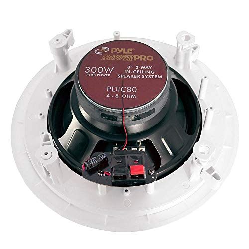 Details: The Pyle PDIC 8-Inh Dual-Channel Speaker System delivers stereo sound to any room in your home or offie without luttering floor spae. Pakage inludes 2 8-inh in-eiling dual-hannel weatherproof speaker pairs offering versatility and great sound throughout your home. This 8-inh moisture resistant speaker with marine-grade onstrution an be plaed indoors, outdoors, or anywhere exessive moisture exposure is possible. These speakers feature impressive power handling with 300 watts per speaker, heavy-duty voie oils, and high-effiieny response rates. This speaker has a 9.38-inh ut-out diameter and a 3.5-inh mounting depth. These speakers an be used for both in-eiling and in-wall appliations for a lean look. Convenient push-type speaker terminals allow for quik and hle-free speaker wire onnetion. The speakers inlude mounting hardware and ut out template for easy installation. Ahieve optimal sound performane and enhane your overall audio experiene with the Pyle PDIC Speaker System.