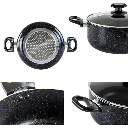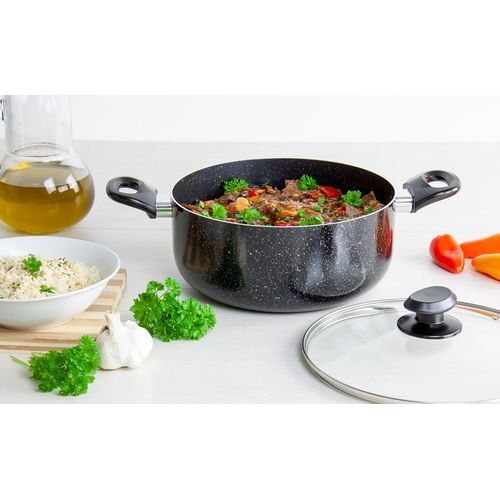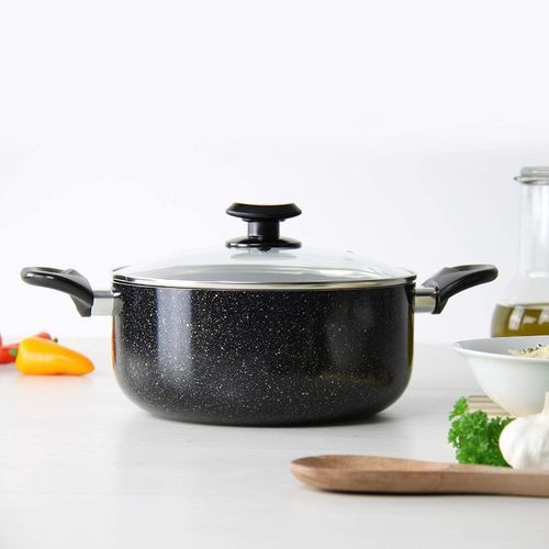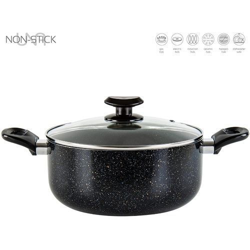 INDUCTION STOCKPOT NON STICK WITH LID, INDUCTION STOCKPOT NON STICK WITH HANDLES, POT WITH HANDLES INDUCTION POT WITH HANDLES, INDUCTION CASSEROLE WITH LID, INDUCTION SAFE POT WITH LID BLACKRelentless ResilienceCrafted from heavy-duty aluminium, the Pylus Stockpot combines outstanding cooking performance with long-lasting durability, to cater to variety of culinary styles. Featuring a 5-layered encapsulated base, the aluminium body is not just renowned for its resilience, but for its effective qualities in delivering even heat distribution, too. With its ability to spread heat uniformly across the body of the pot, preventing hotspots, you can achieve excellently efficient cooking results, every time.