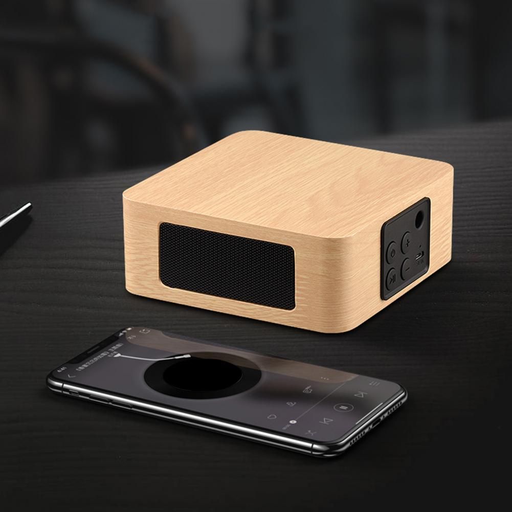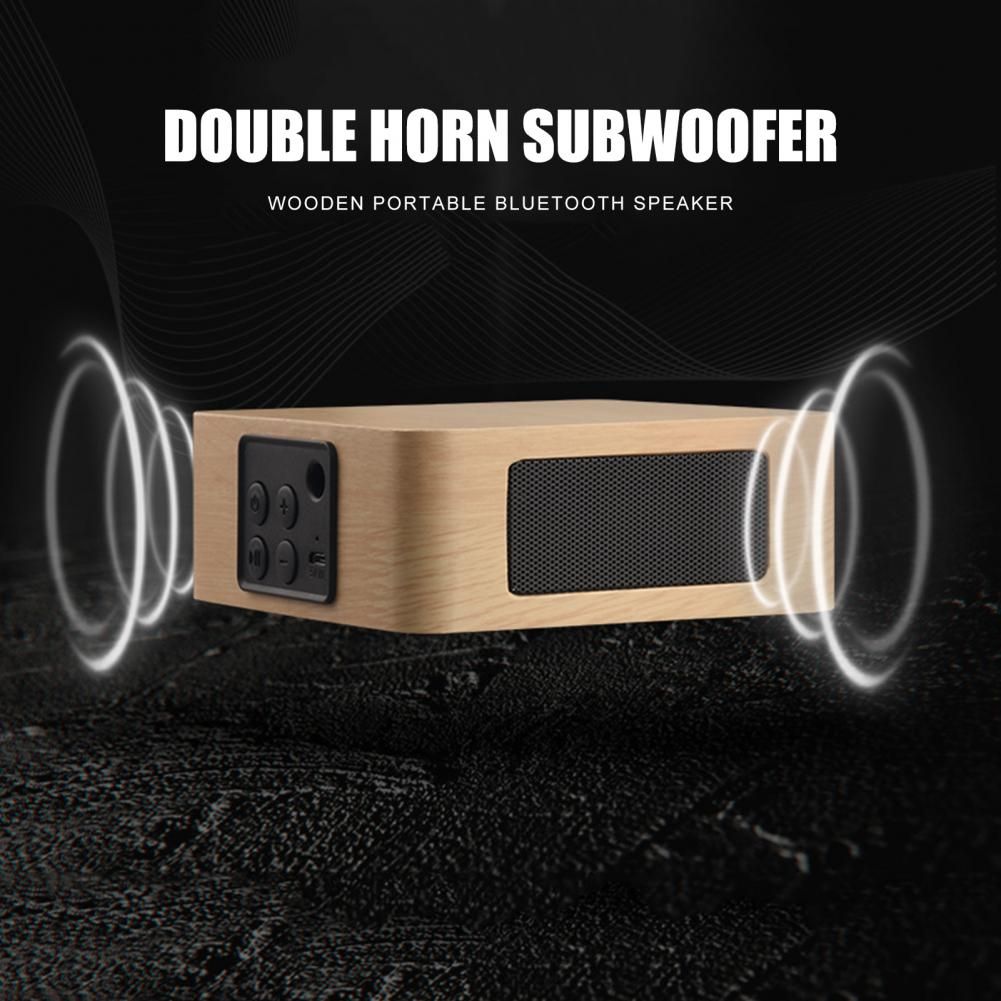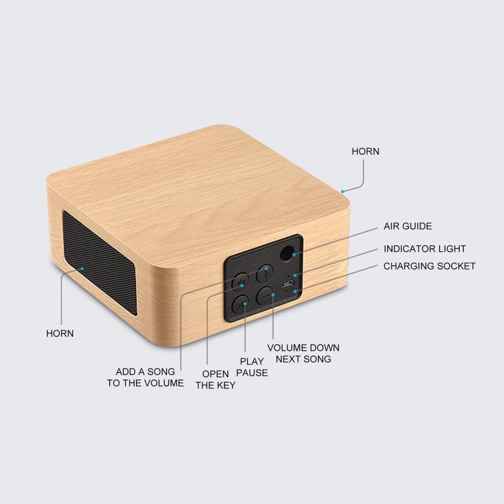 A Mini Wood Bluetooth Wirele Speaker Music Player for Phone Computer Pad Specifications: Equipped with air guide holes, more flexible ba sinking and clear sound drums,this double speakers produce strong sound effects and can let you enjoy the pure music. Withhigh-density synthetic fiber wood, it can effectively eliminate thebad resonance. The upgraded bluetooth signal is stable, with strong anti-interference, and good sound quality whenever and wherever poible. The built-in 1200mAh lithium battery can last 6-10 hours on full charge, allowing you to enjoy music to your heart's content. It is fully compatible with mobile phones, computers, tablets and other devices with Bluetooth, as well as all kinds of music playing software. Item Name: Bluetooth Loudspeaker Material: Synthetic Fibre Wood Output Power: 3W Volume control: on Box: Wooden Box Speaker: x 2 Battery: 1200mAh (Included) Bluetooth: 4.2 Transmiion Distance: 10m Loudspeaker: 3W x 2 Playing Time: 6-10 Hours Charging Time: 2 Hours Features: Long Standby Time, Bluetooth, Music Player Size: 12cm x 12cm x 4.5cm/4.72" x 4.72" x 1.77" (Approx.) Notes: Due to the light and screen setting difference, the item's color may be slightly different from the pictures. Please allow slight dimension difference due to different manual measurement. Package Includes: 1 x Bluetooth Loudspeaker 1 x USB Cable
